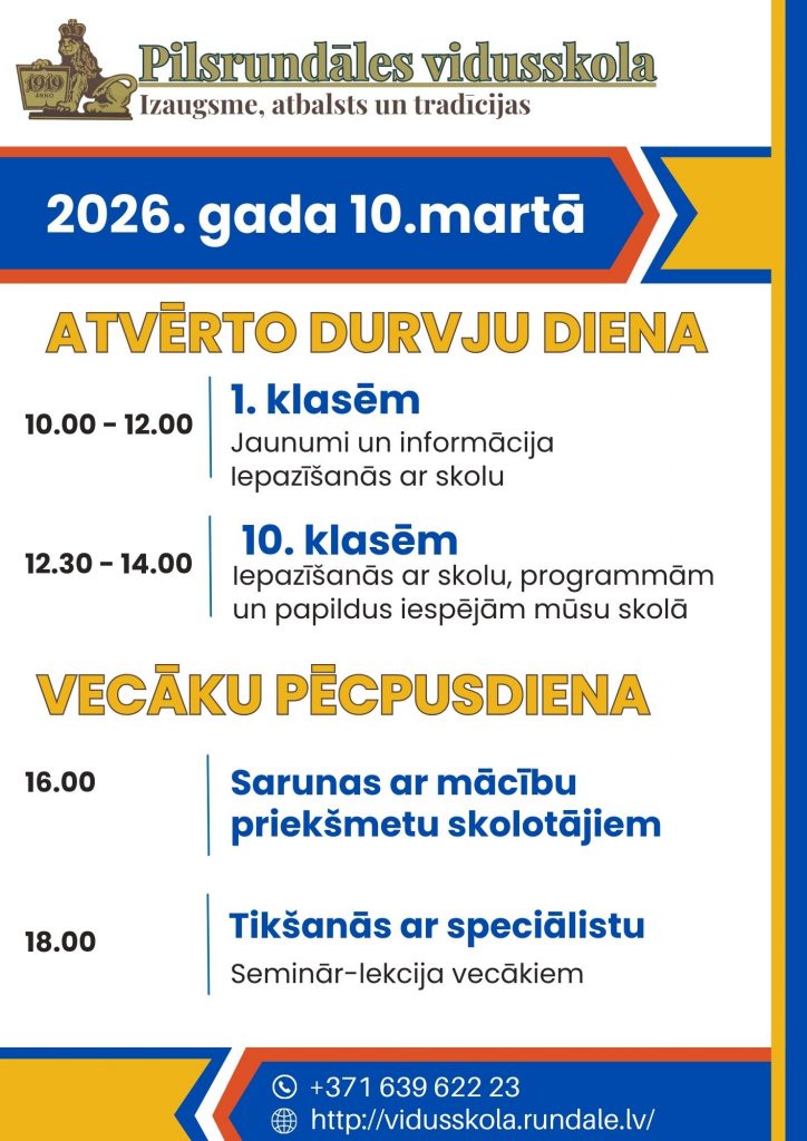 Pilsrundāles vidusskola aicina skolēnus un vecākus uz Atvērto durvju dienu, lai iepazītu skolas vidi, mācību programmas un plašās iespējas, ko piedāvā mūsu vidusskolas posms.