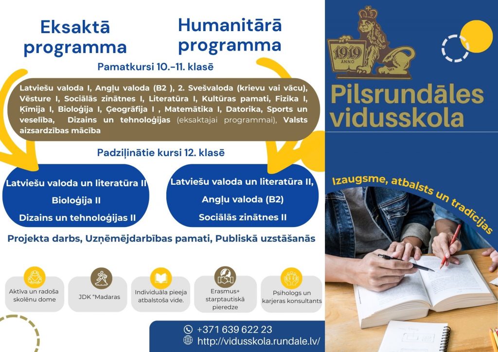 Pilsrundāles vidusskola piedāvā mūsdienīgu, uz izaugsmi vērstu vidējās izglītības posmu, kurā skolēns var izvēlēties sev piemērotāko mācību virzienu un attīstīt prasmes turpmākajām studijām un profesijai. Mēs esam maza skola ar lielām iespējām – vieta, kur katrs skolēns tiek redzēts, atbalstīts un iedvesmots sasniegt savu labāko rezultātu.