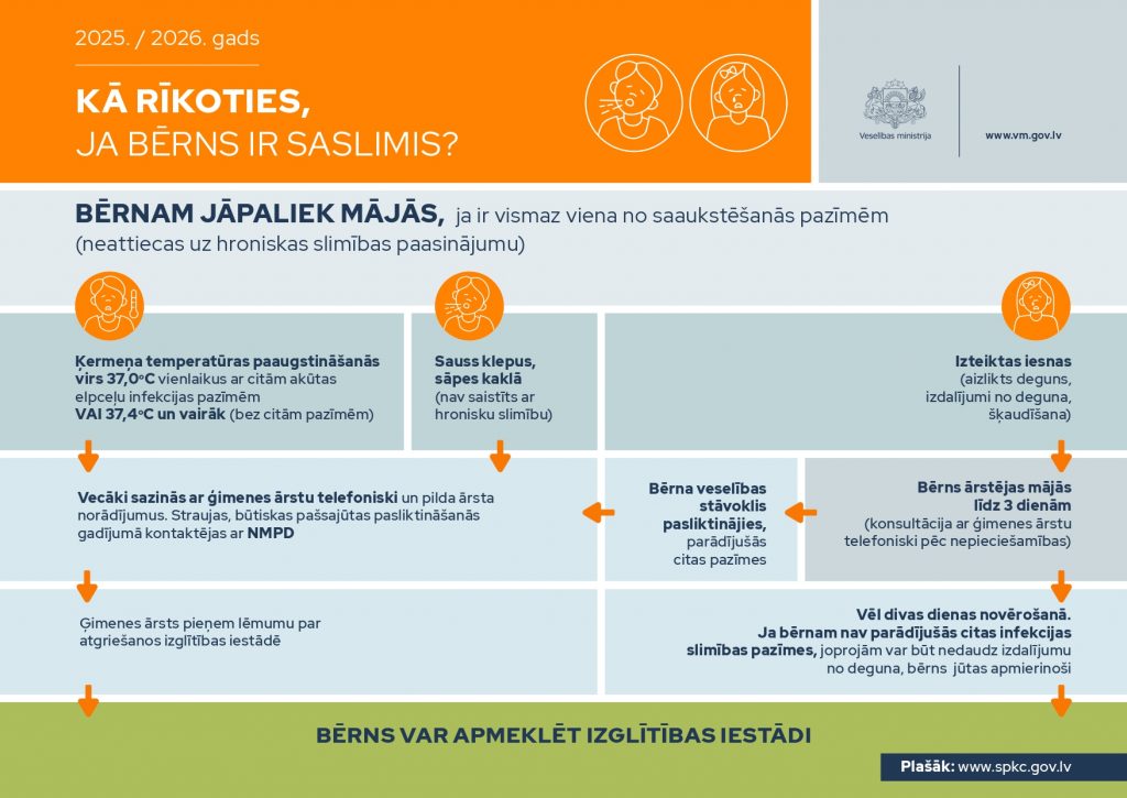 Veselības ministrija un Slimību profilakses un kontroles centrs aicina izglītības iestādes uzticēties vecāku sniegtajai informācijai par bērna veselības stāvokli un samazināt ārsta izziņu pieprasīšanu vieglu saslimšanu gadījumā. Šāda pieeja atvieglo veselības aprūpes sistēmas noslodzi un sekmē sadarbību starp vecākiem un skolām. Pielikumā pievienots SPKC izstrādātais rīcības algoritms gadījumam, ja bērnam ir akūtas elpceļu infekcijas pazīmes.